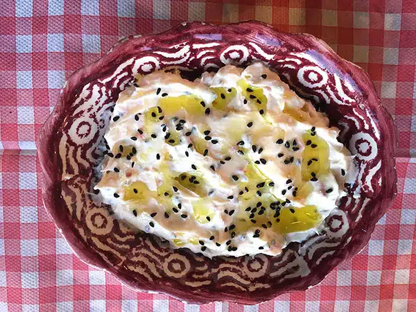 3. Pak de labneh uit en schraap hem in een kom. Meng de chilipeper en de fenegriek en nigella zaadjes erdoor. Sprenkel er wat olijfolie overheen.