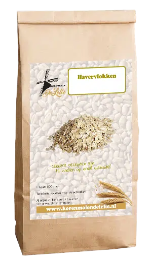 Onze molen maalt biologisch geteeld graan tot vele soorten meelproducten die wij vervolgens verwerken tot verschillende mixen volgens eigen recept. Door gepelde haver te schonen, te ordenen, te stabiliseren en daarna te stomen en te walsen, ontstaan havervlokken, die vervolgens worden gezeefd. Met hun milde smaak zijn ze uitstekend als garnering voor brood of als ingrediënt in verschillende gerechten. Deze biologische havervlokken worden verpakt in onze eigen molen. Wij gebruiken deze havervlokken ook in andere producten. Bevat geen conserveringsmiddelen of andere toevoegingen.