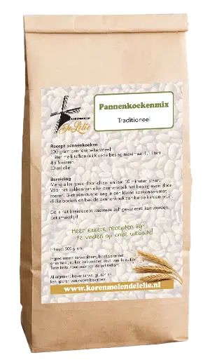 Onze molen maalt biologisch geteeld graan tot vele soorten meelproducten die wij vervolgens verwerken tot verschillende mixen volgens eigen recept, zoals deze volkoren pannenkoekenmix.