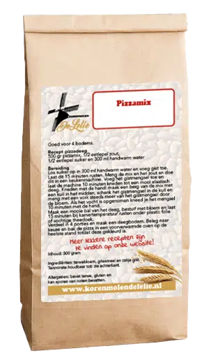 Onze molen maalt biologisch geteeld graan tot vele soorten meelproductendie wij vervolgens verwerken tot verschillende mixen volgens eigen recept, zoals deze pizzamix. Ingrediënten: tarwebloem*, griesmeel* en een los zakje droge gist. Bevat geen conserveringsmiddelen of andere toevoegingen.