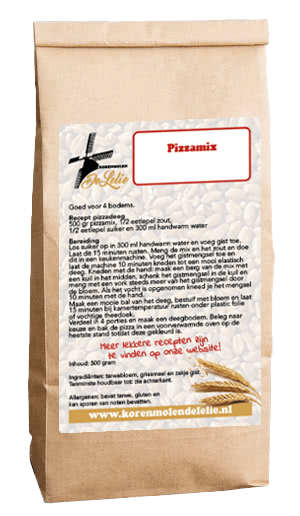 Onze molen maalt biologisch geteeld graan tot vele soorten meelproductendie wij vervolgens verwerken tot verschillende mixen volgens eigen recept, zoals deze pizzamix. Ingrediënten: tarwebloem*, griesmeel* en een los zakje droge gist. Bevat geen conserveringsmiddelen of andere toevoegingen.