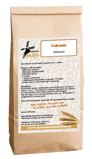 Onze molen maalt biologisch geteeld graan tot vele soorten meelproducten die wij vervolgens verwerken tot verschillende mixen volgens eigen recept, zoals deze volkoren cakemix. Ingrediënten: volkoren tarwemeel, tarwebloem, griesmeel. Goed voor 2 cakes. Bevat geen conserveringsmiddelen of andere toevoegingen.