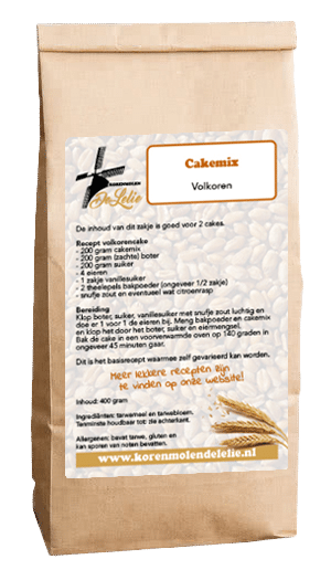Onze molen maalt biologisch geteeld graan tot vele soorten meelproducten die wij vervolgens verwerken tot verschillende mixen volgens eigen recept, zoals deze volkoren cakemix. Ingrediënten: volkoren tarwemeel, tarwebloem, griesmeel. Goed voor 2 cakes. Bevat geen conserveringsmiddelen of andere toevoegingen.